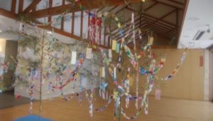 わが住むマンションの恒例の七夕祭り。いつもは子どもも大人も集まってわいわいと飾りを作り、短冊に願いを書くのだが、今年は集会禁止、七夕飾りだけが寂しくホールの空間を埋めていた。(地域に生きる 65)