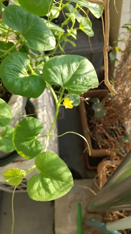 みんなのコラム 9/24 マスクメロンに花が咲いた 2020/10/4 olive http://www.lifev.com/journal/wp-content/uploads/2020/10/201005_070717-3.mp4 まさかの奇跡、とは大げさながら、種から育てたマスクメロンの「木」に花が咲いた。今朝など10個ほどの、黄色いつぼみの気配を見つけた。いずれも首の細い雄花?らしき。➡ 葉も茎もぐんぐん伸びて、蔓は行く手を阻む葉の裏側をつつくので、若い葉は葉脈のみのレース状に枯れていく。 そして10月4日、マスクメロンの雌花が咲きました。(上)