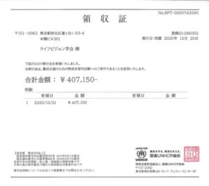 代わって皆様に、特定非営利活動法人・国連UNHCR協会への「現金によるカンパ」拠出のお願いをしたところ、43個人・団体名様から407,150 円をお預かりすることができました。ありがとうございました。2020年12月21日、以下の通り送金致しました。