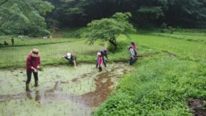 私たちが関わっている「合歓の里」の谷戸も、20年前までは耕作を放棄された鬱蒼(うっそう)とした藪に過ぎなかった。そこへ都会の不届き者たちが廃材や引っ越しの後始末の粗大ごみを持ち込み、不法投棄の巨大なゴミ捨て場と化していた。谷戸の地主の家系で田んぼを引き継いだ元市役所職員の天野三男氏は、一念発起して田んぼの再生に取り組み、自身の軽トラックを数十回も往復させて粗大ごみを運び出した。生い茂る藪を切り払い、伸びた灌木を焼く孤軍奮闘の日々を経て、やっとのことで昔の棚田が取り戻されたのである。私たち「さんさんくらぶ」の子どもたちや親たちが、天野さんの苦闘の賜物である棚田の内の2枚ほどを「さんさん田んぼ」として請け負って米作りを始めてからもう15年ほど経つ。