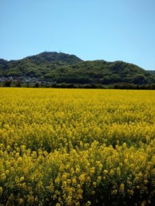 「久しぶりに外の空気を思いっきり味わいたい、でも、山はダメよ。」と言うM子のリクエストに応えて、菜の花畑でランチすることにした。お弁当は彼女が、私はドリップコーヒーとお茶を準備した。当日は快晴、菜の花のあぜ道をたらたらと歩くのは気持ちが良い。棕櫚の葉(ビニール製?)の日よけの下に木の椅子とテーブルがセットしてあった。横並びでも飛沫は防げないとニュースで言っていたが、M子と横並びで座る。平日にも関わらず2~3人ずつのグループで間隔を空けた席は満席。駐車場にも次々と車が入ってくる。