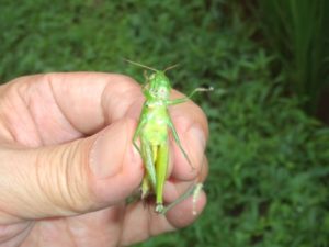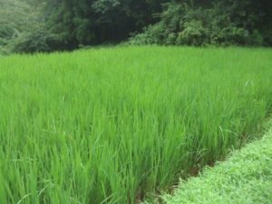 夏の終わりの田んぼは青々と茂り、稲の穂が出て陽光のもとで輝いている。この緑の海を我が物顔に飛び回っているのがイナゴだ。今年も収穫の一部を彼らにも分け与えないといけないようだ。