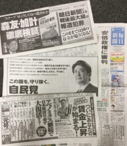 「この国を守り抜く自民党」という安倍首相の写真入りの広告(6面)に始って頁を繰っていくと、「スクープはこうしてねつ造された 朝日新聞による戦後最大級の報道犯罪 森友・加計徹底検証、安倍総理は白さも白し、富士の白雪だ」(4面)、さらに「アベノミクス継続で日本経済は必ず大復活する ついにあなたの賃金上昇が始まる」(8面)と、どれが書名なのか、わからぬ安倍・自民応援のメッセージばかりの書籍の広告が続いていた。通常の書籍広告は書店が出版している複数の書籍を掲げるか、一冊なら小ぶりの広告がならぶ。しかし、今回の毎日の広告は一冊のみの広告だ。だから、書籍名がどこにあるのかわからぬほど政治的メッセージがどんと載せることができる。狙いは書籍にあるのではなく、安倍応援にあるのは明々白々だ。