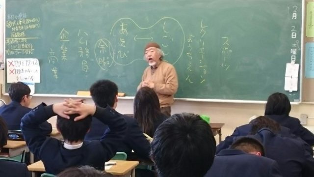近くの中学校に招かれて「しごととあそび」の話をした。生徒は中学一年生、自分より60歳若い同じ干支なのが嬉しかった。まずまず、しっかり聴いてくれた。